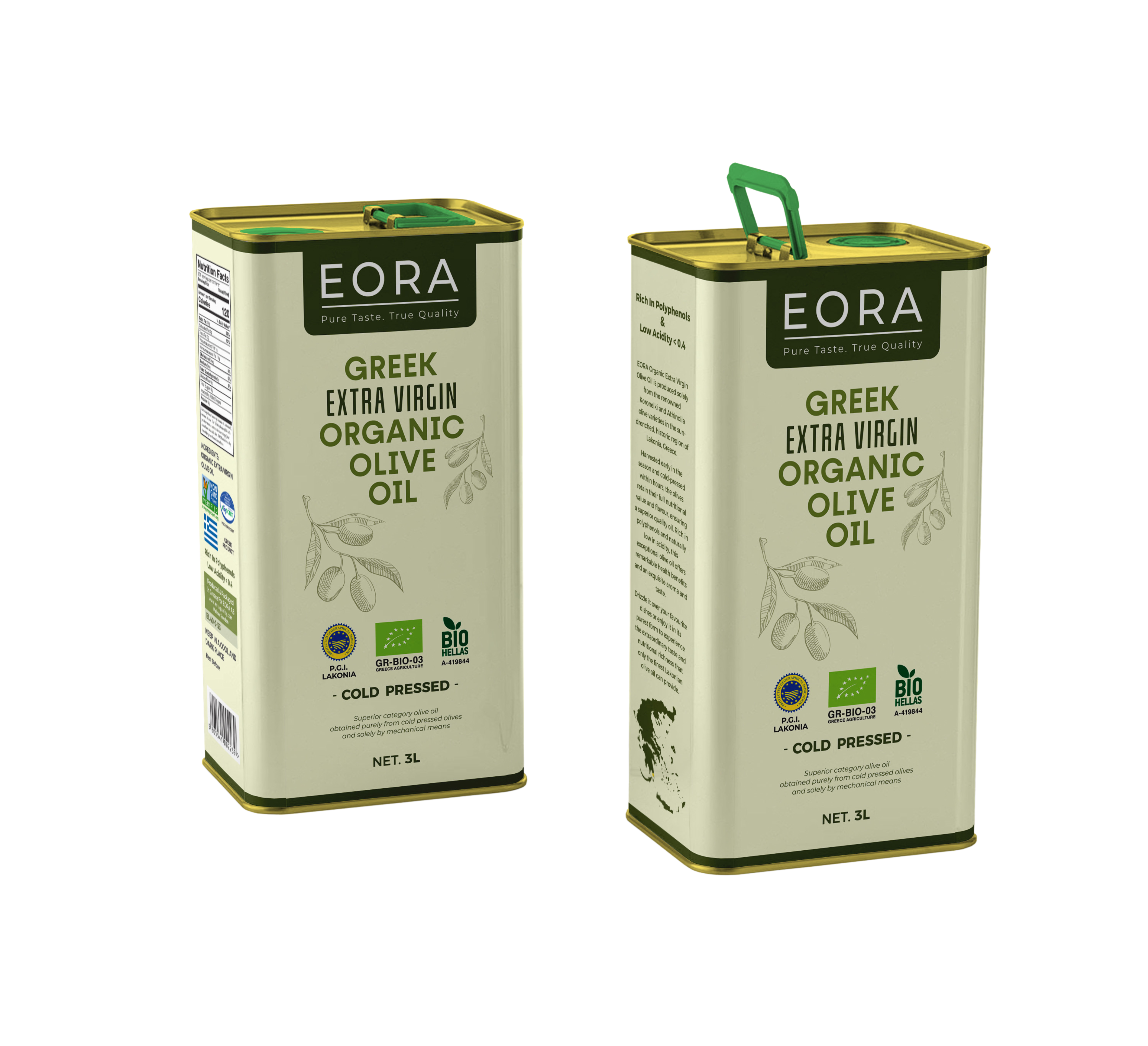 EORA's PGI LAKONIA Organic Extra Virgin Olive oil is crafted from the finest olives grown in the heart of Laconia, Peloponnese, Greece. EORA’s extra virgin olive oil is carefully hand-harvested and cold-pressed to maintain its deep, aromatic flavour. With very low acidity and very high polyphenol levels, it offers unparalleled quality, purity, and health-enhancing properties.