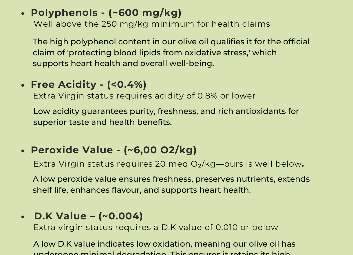 below the extra virgin limit of 20. Most notably, our oil boasts an exceptionally high polyphenol content of ~614 mg/kg, far exceeding the health claim threshold of 250 mg/kg offering both exceptional flavour and remarkable health benefits